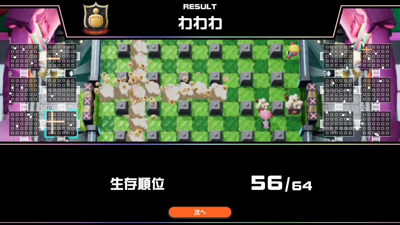 今日は戦闘意欲の高い人となかなか当たらなかったからか2位ばっか取ってしまった!あとDrawも何回か 時間帯によってゆるふわな時間とガチタイムがあるのかな…? #ボンバーマン