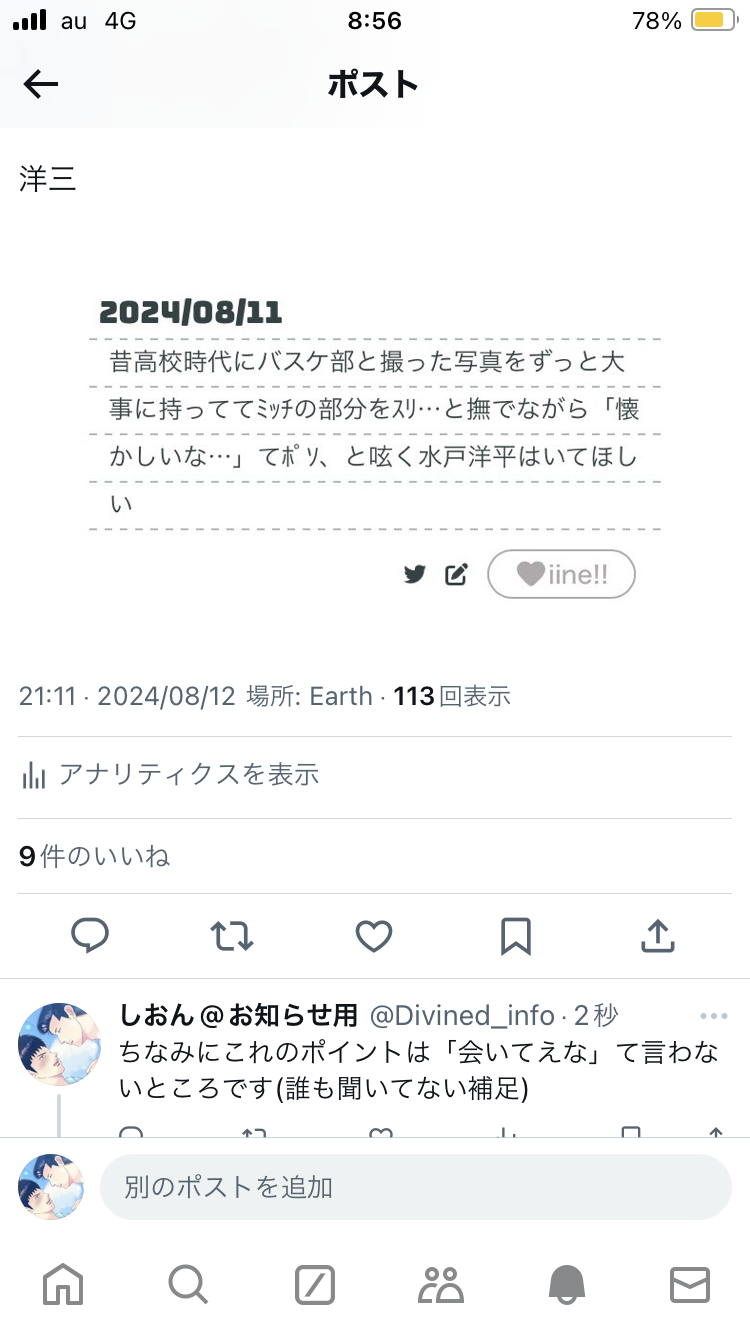 昔高校時代にバスケ部と撮った写真をずっと大事に持っててミッチの部分をスリ…と撫でながら「懐かしいな…」てポソ、と呟く水戸洋平はいてほしい