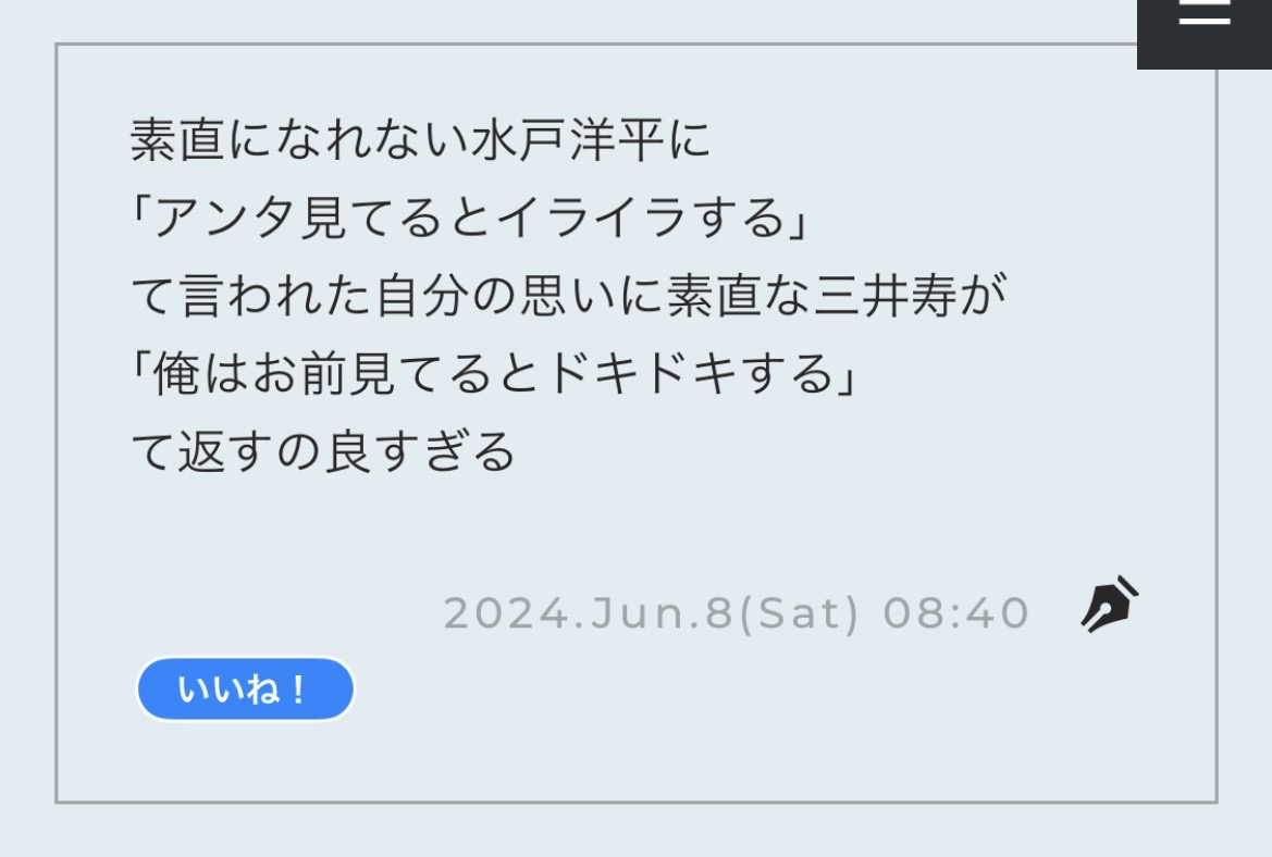 水戸洋平「あん時はムカついたけど今は好きさ!(好意)」