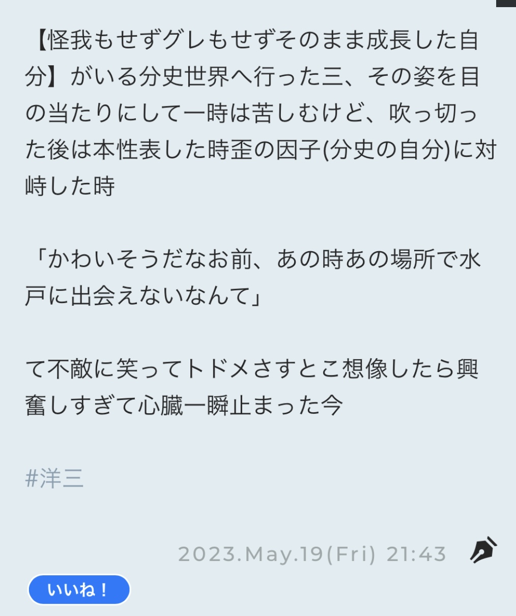 昨日の夜寝る前洋三思いついたのに朝起きたら忘れたーー😭😭😭て思ってたけど寝る直前にメモしたこと思い出した オメーは天才か