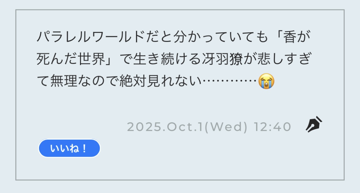 エンジェルハート、パラレルワールドだと分かっていても「香が死んだ世界」で生き続ける冴羽獠が悲しすぎて無理なので絶対見れない…………😭