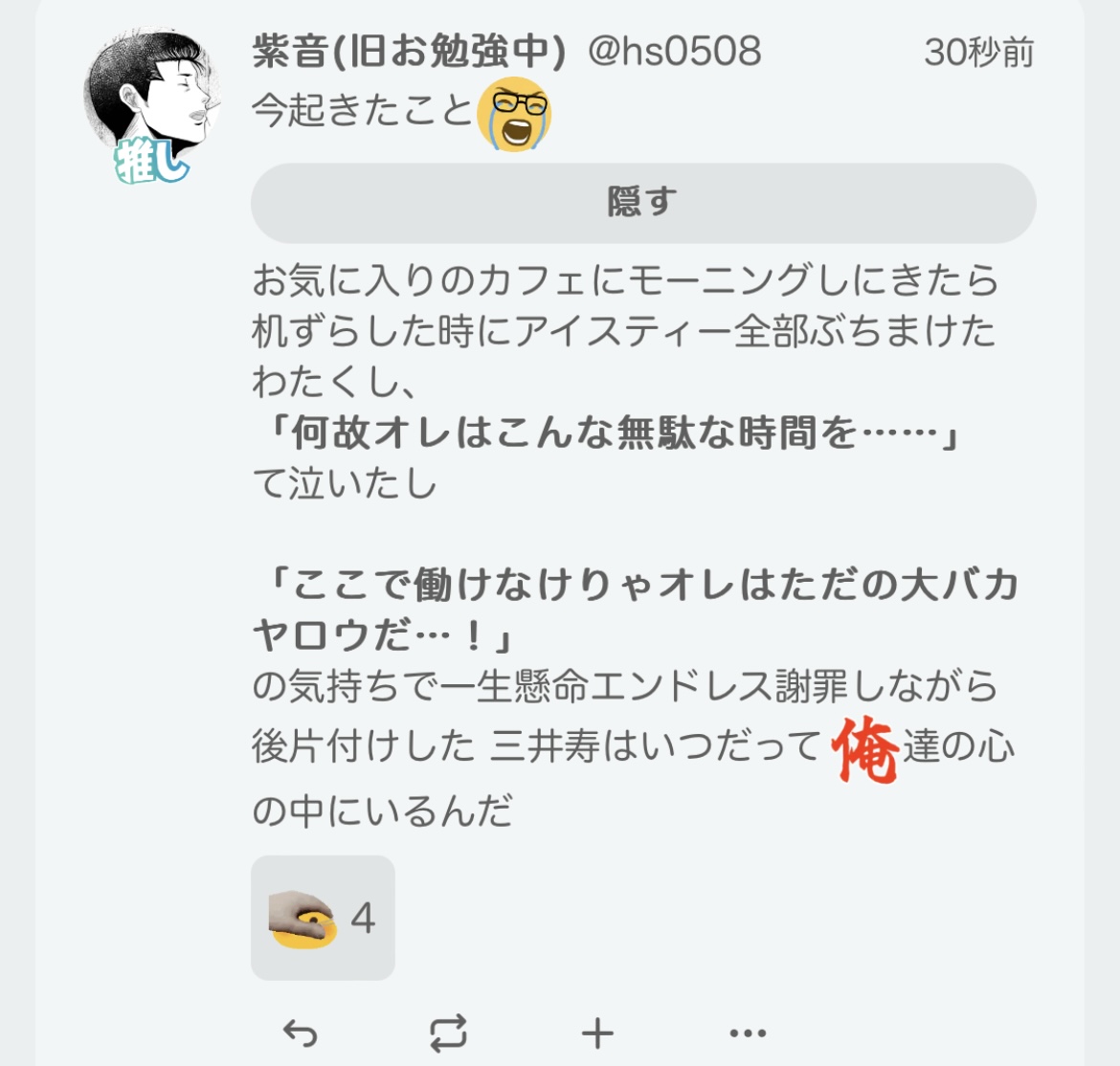 「自分が漫画の中のキャラクターだと知っている水戸洋平くんの話(シリアス)」と「腐女子vsオレ(クソギャグ)」ていう2本立ての水戸くんメインの話(がっつり洋三)描きたいなってずっと思っている