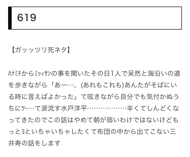 あと、今まで付き合ってきた中で誰にも好きという感情を持てずミッィサンに惚れて初めて恋を知るミトヨも好きだけど、今までの人生で1度だけ心から好きになった女の人がちゃんといたミトヨもいいなって思う(ハナミチはまた別枠)